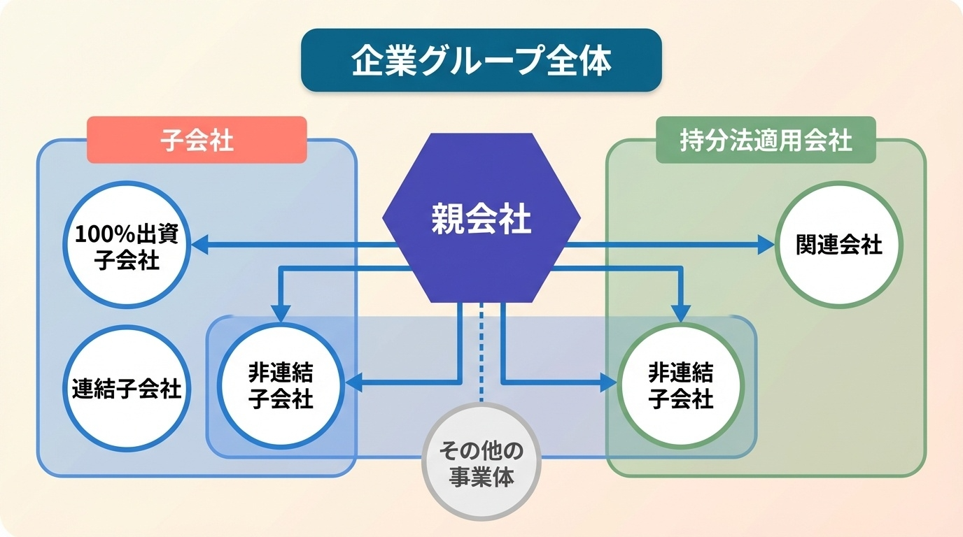 グループ会社の構造として、親会社の傘下に、完全子会社、連結子会社、非連結子会社などの子会社や、あるいは関連会社が存在するということになります。